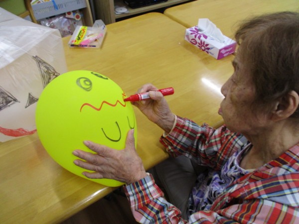 風船遊びを行っています( ^ω^)・・・ 先ずはじめに風船に顔の絵を書きました。風船????遊びを行いました(*^_^*)