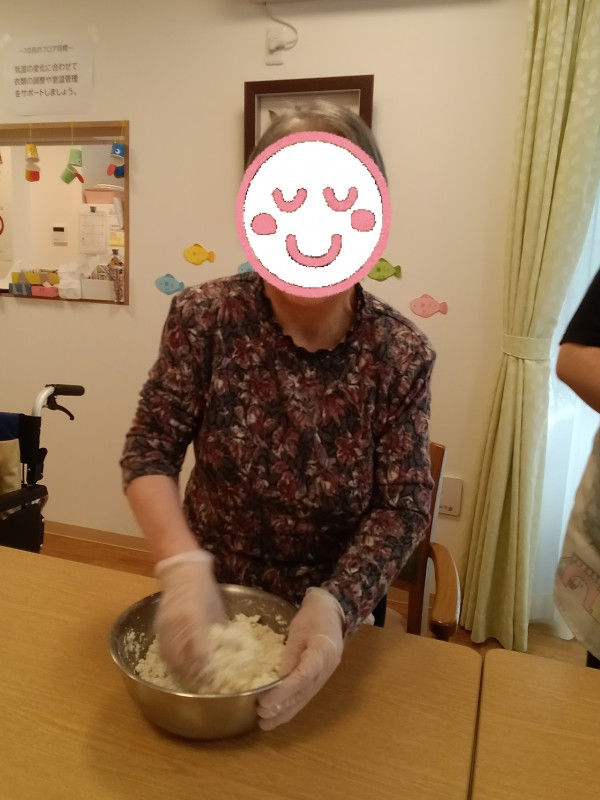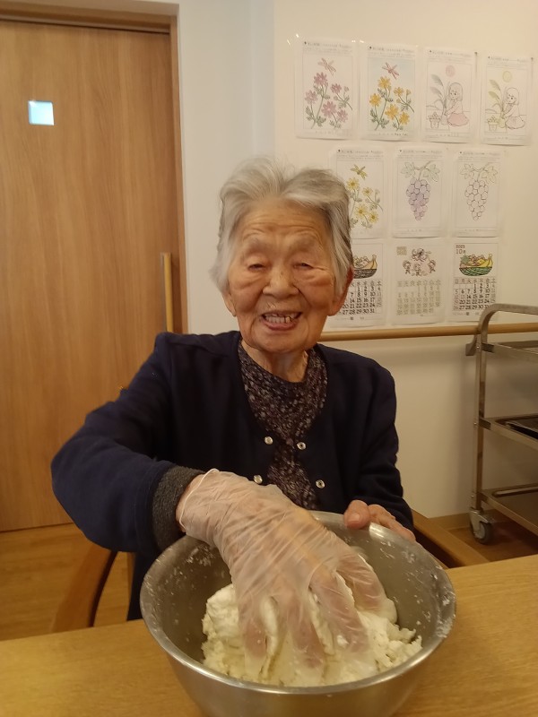 「こねるの楽しいわね!」「これから何が出来るのかしら」と会話を弾ませながら生地作り♪