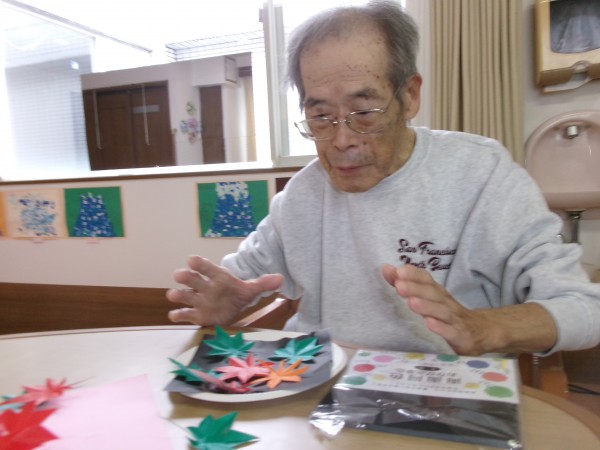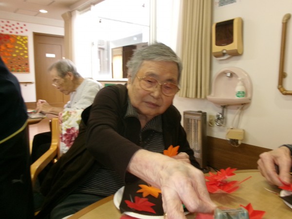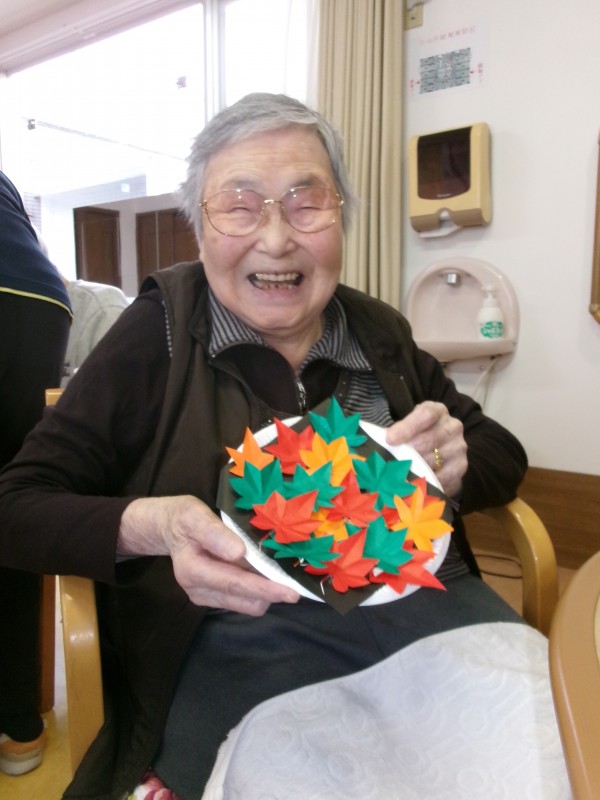 紙皿とおりがみのもみじを使い、“紅葉”を