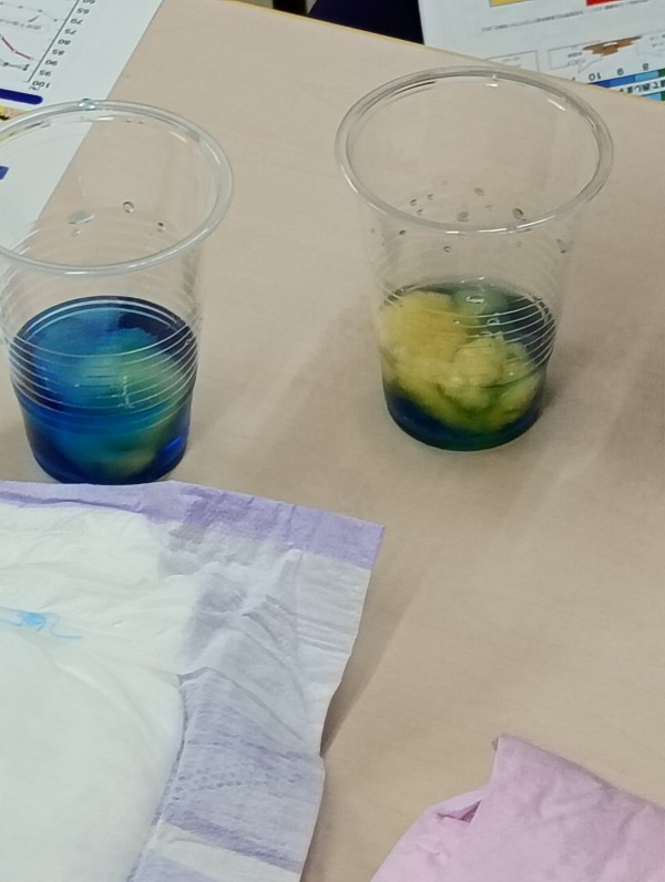 このお水がアルカリ性だと証明するものです…それに普通のオムツパットに入っているパルプを入れると…そのままアルカリ性の状態ですが、現在草加青柳で使用しているオムツ・パットのパルプを入れるとみるみる黄色くなっていきます…これはアルカリ性だったお水が弱酸性に変化したことを示しています。