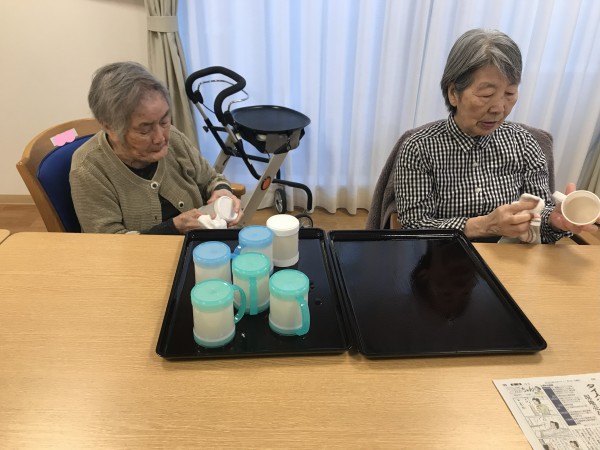 朝食時のお盆やコップ等拭いてくださっています(*^▽^*)1日の中で皆様たくさんの家事を楽しみながら手伝って下さっています♪