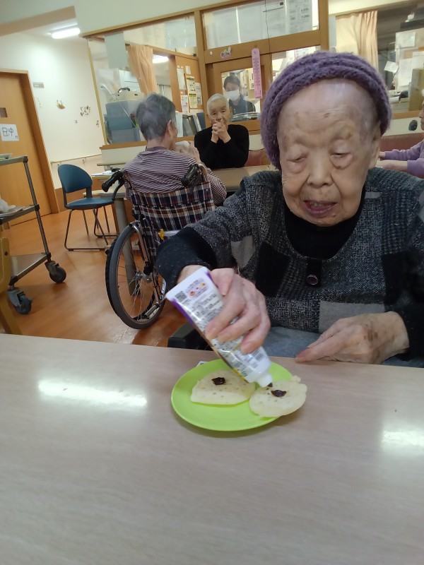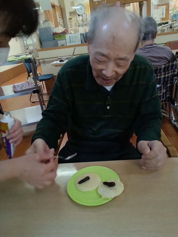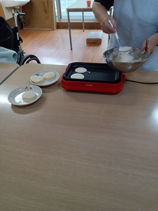 職員が焼いたパンケーキに餡子を付けて挟んで・・・どら焼きの完成!!