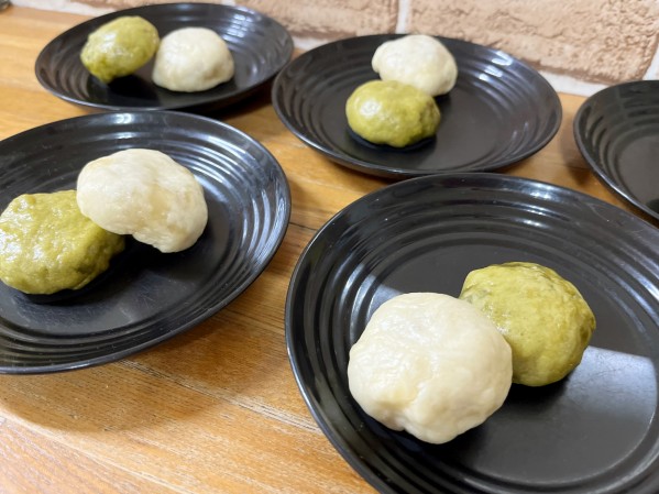 白い生地には白餡、そして緑色の生地には抹茶を練り込み、中にはずんだ餡が入っています。