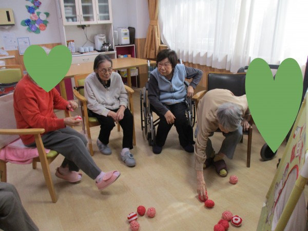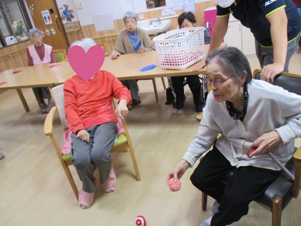 この日は、紅組!青組!と分かれ玉入れとお手玉送り競争を行いました