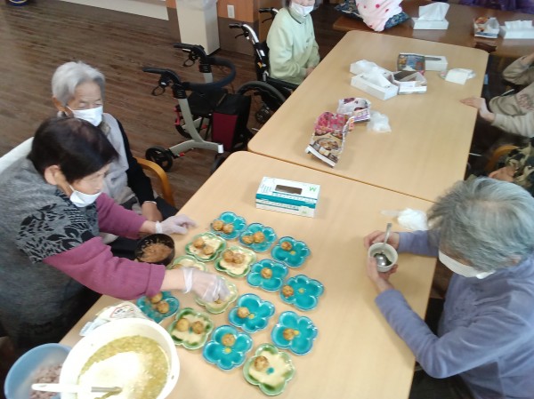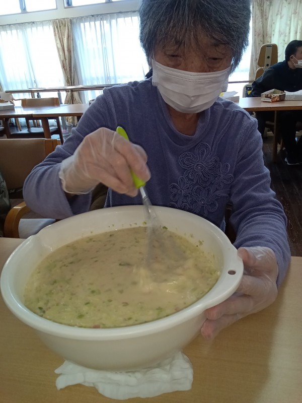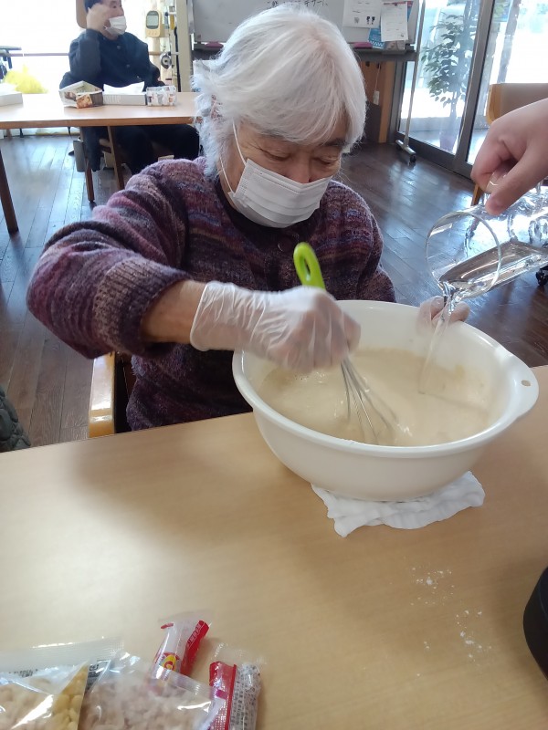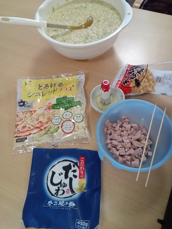 本日は毎回皆さんお楽しみの手作りおやつでした。今回はタコ焼きを2種類チーズ入りと魚肉ソーセージいりを用意しました。