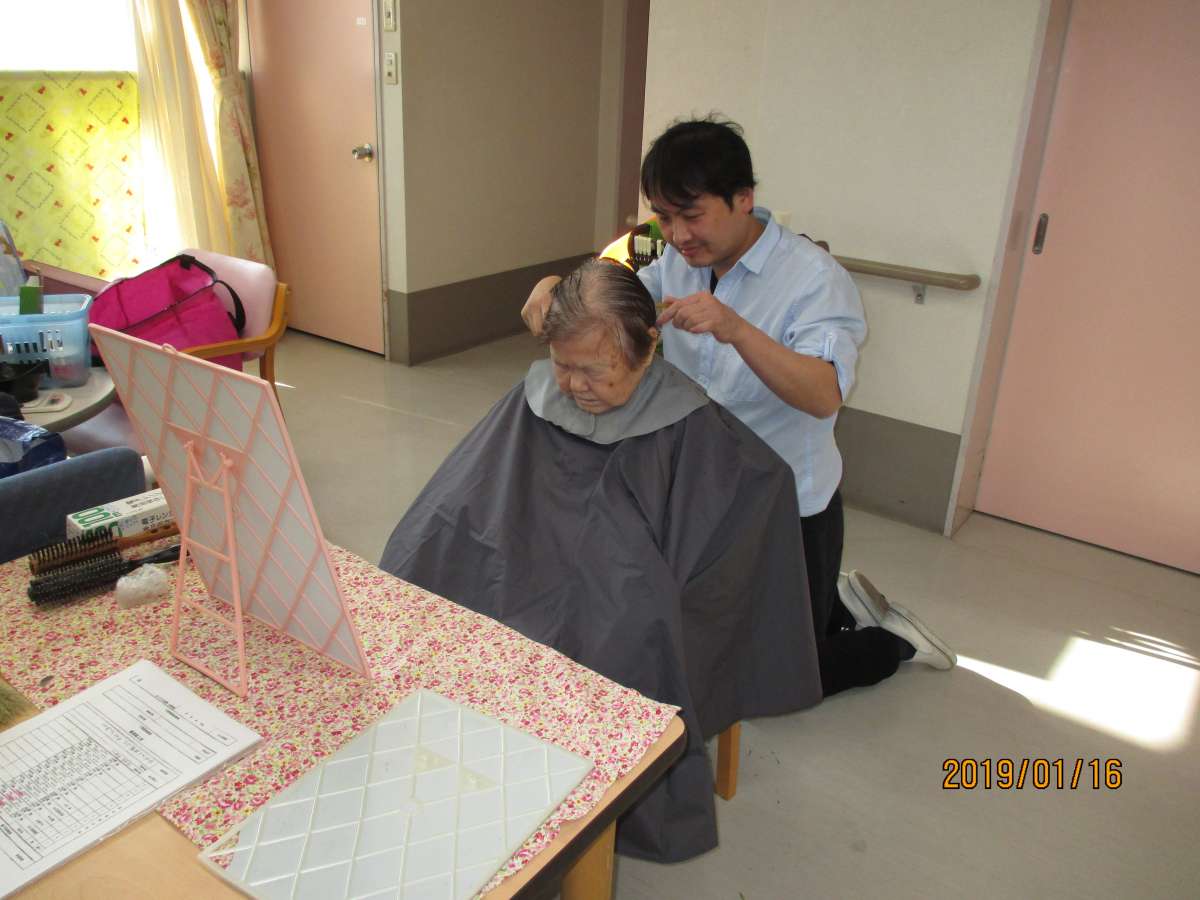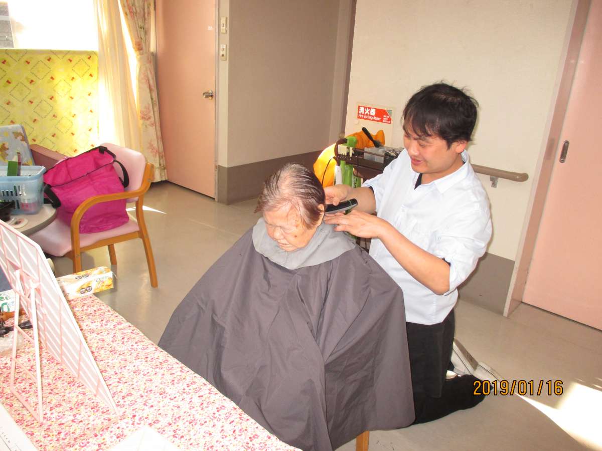 毎月訪問理美容の広瀬さんが 皆さんの髪の毛を綺麗にして頂いています。