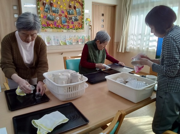 ご入居者様に食後の食器拭きをお願いしています。