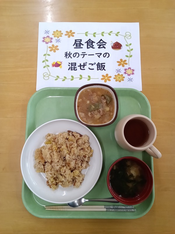メニュー:混ぜご飯(さつまいも・栗・しめじ・えのきだけ・混ぜご飯の素)・肉じゃが・澄まし汁