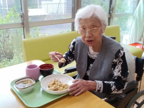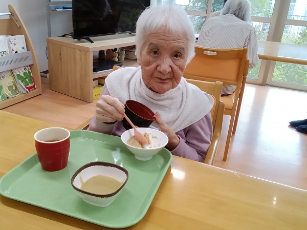 今日は1階・秋の昼食会レクを行いました。 昼食を作り召し上がられているご様子をお知らせいたします!!