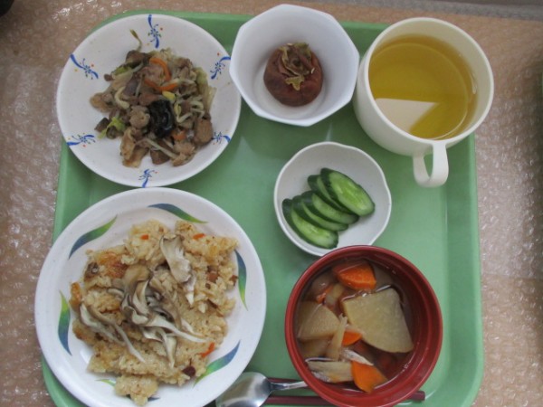 メニュー:キノコご飯・野菜炒め・けんちん汁・デザートです。