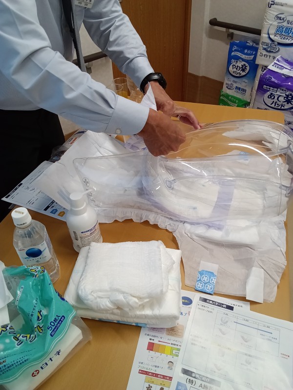 メーカーさん 白十字社の営業様をお呼びして 「正しいオムツの選び方」「高機能のオムツ パット」の説明をして頂きました。