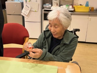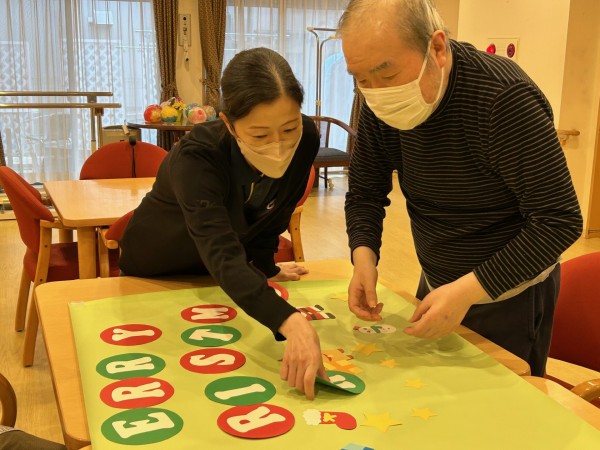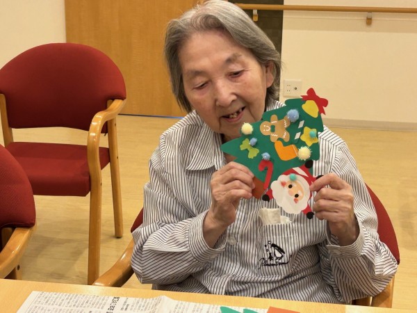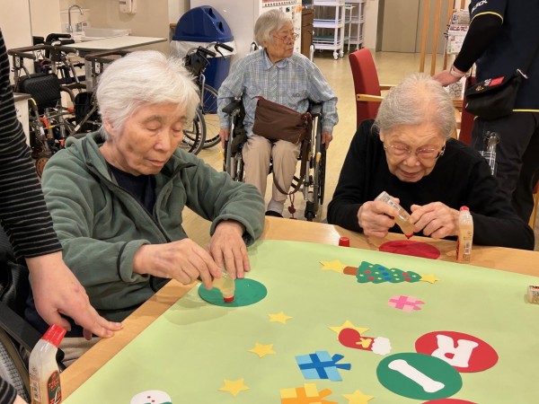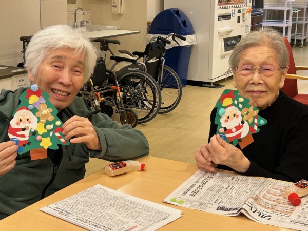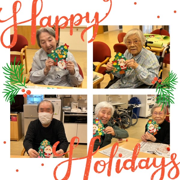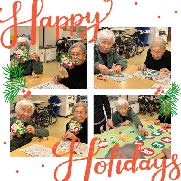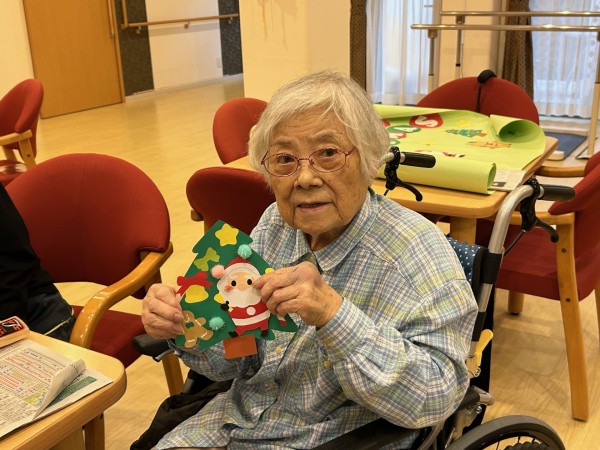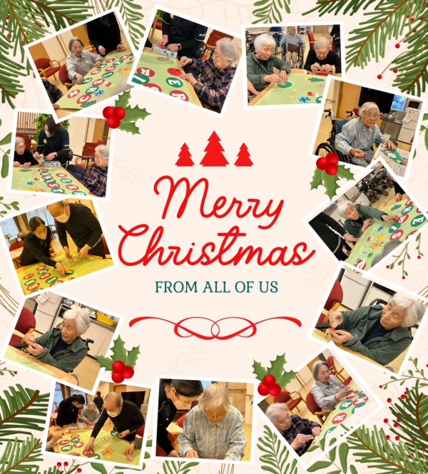 アミカの郷ちとせでも、入居者の皆さまと一緒にクリスマスの準備を始めました。今年は、手作りのサンタさんやプレゼントを飾ったもみの木の壁絵アートを、2つ作成しました。