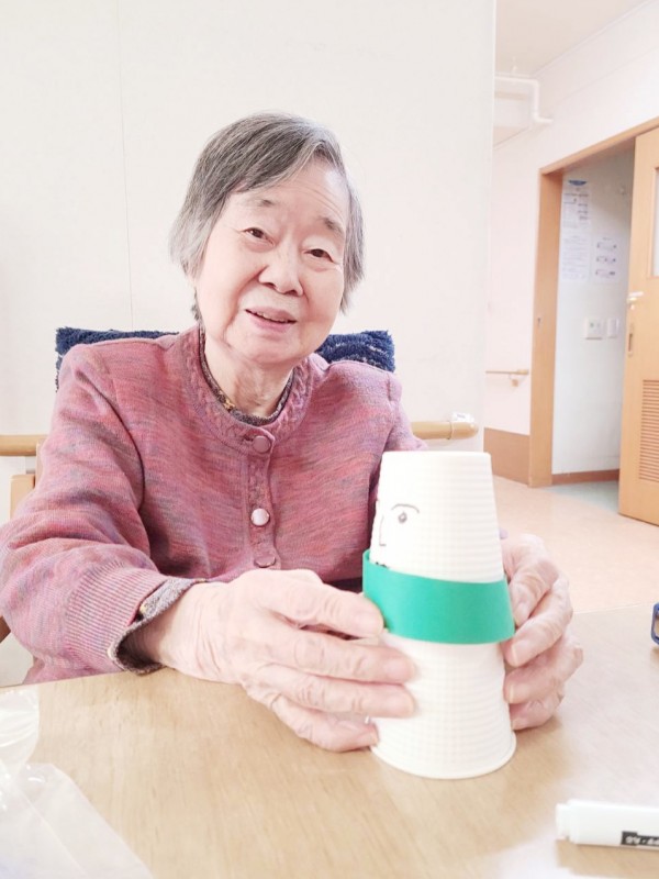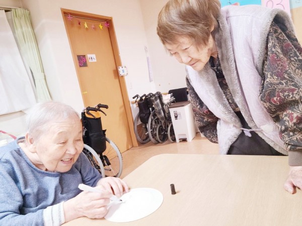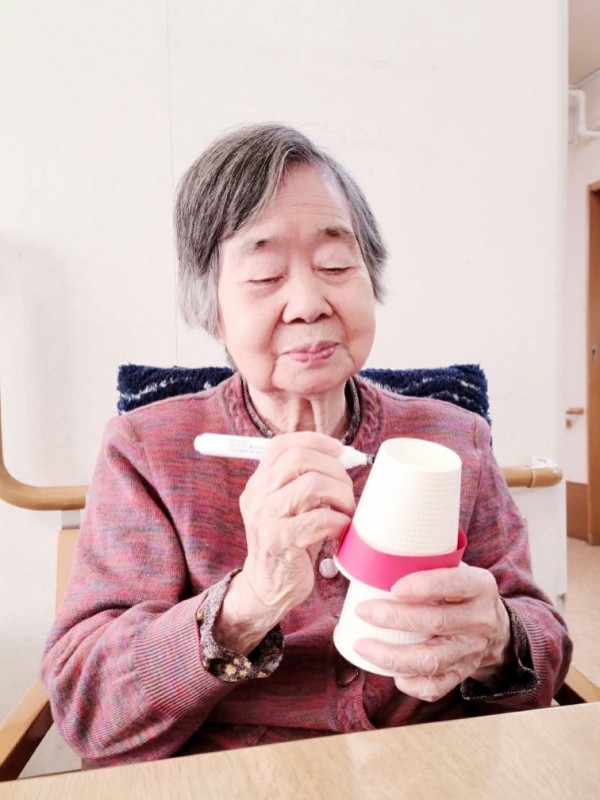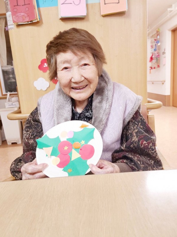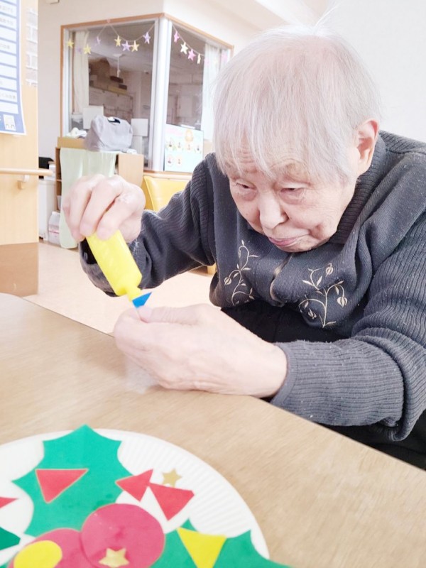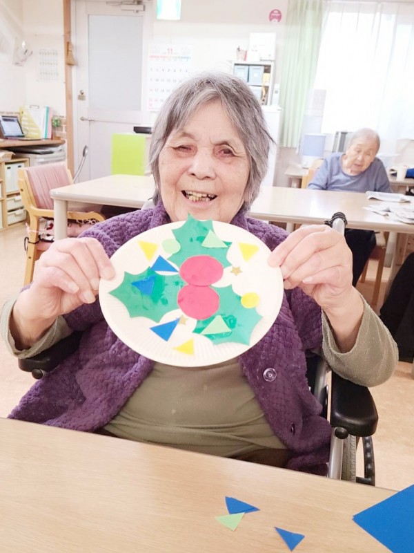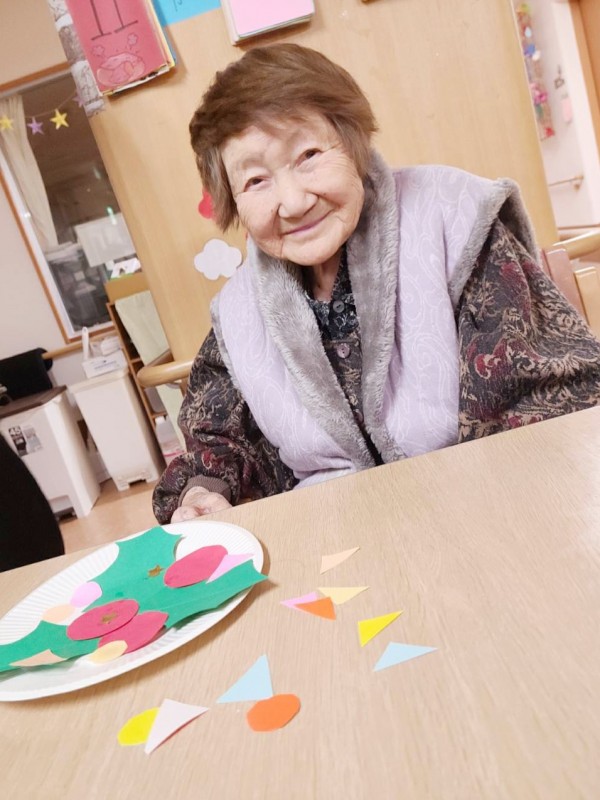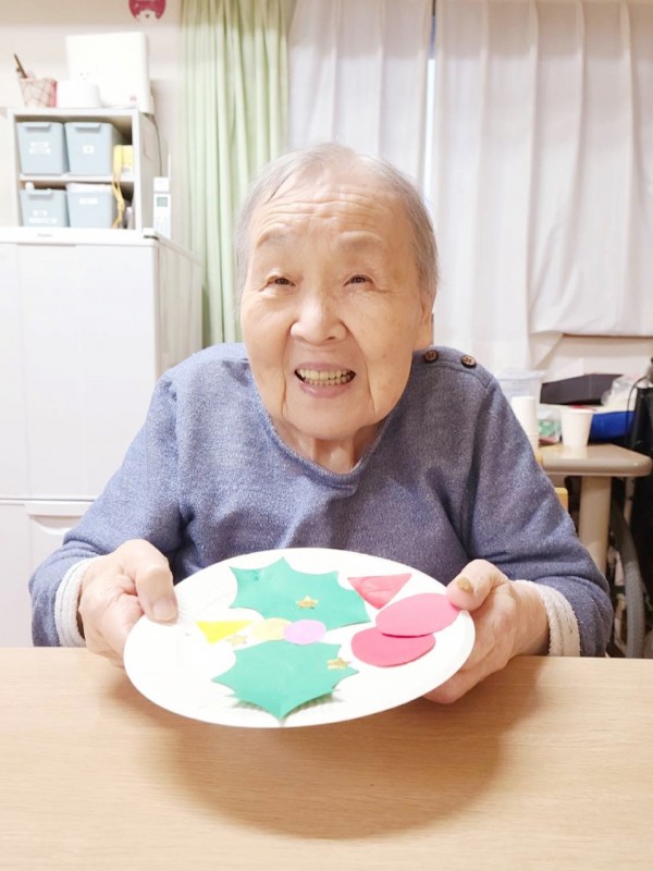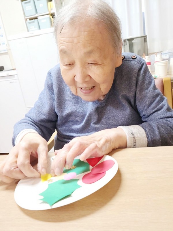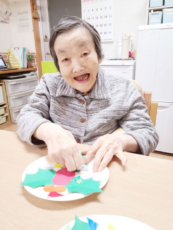 斜め向かいのY様と顔を見合わせながら、楽しそうに作業を進めておられました。職員が完成を褒めると、肩をすくめて照れ笑いされる姿がとても印象的でした。
