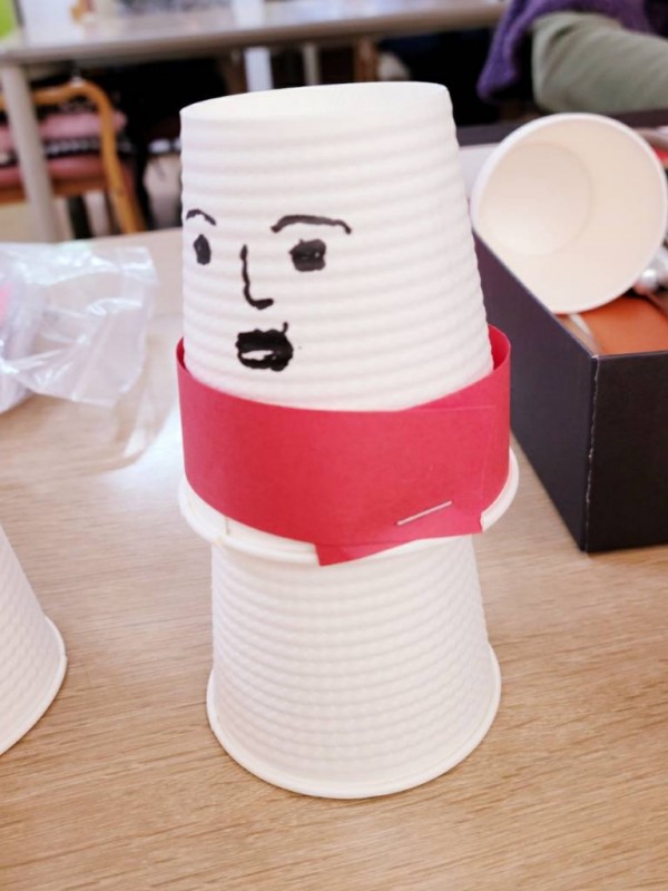 紙コップの雪だるまにはユニークな表情を描き、マフラーに見立てた色画用紙も巻き付けて「変な顔になっちゃった」と大笑い。