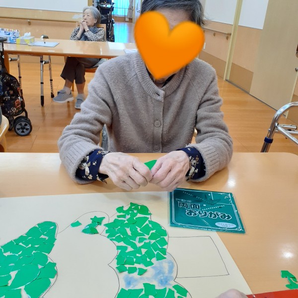 折り紙をちぎり、のり付けをして