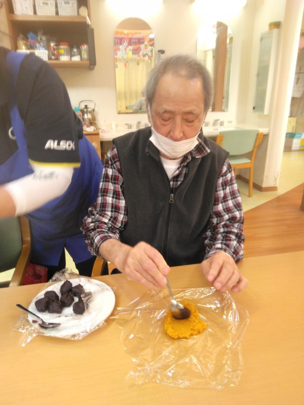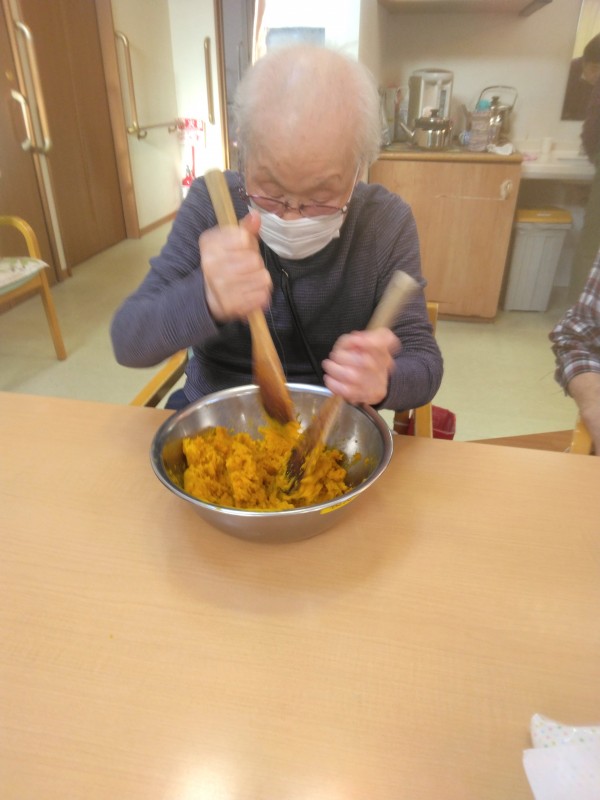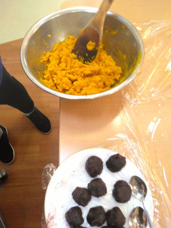 今が旬のかぼちゃをみんなでつぶしてあんこを包んで茶巾絞り(^^)v