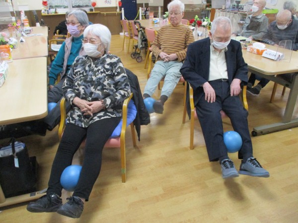 本日午後のレクリエーションは【介護予防運動】です。ボールとセラバンドを使用し、全身をしっかり動かしながら、筋力維持とバランス昨日の強化を目指します。
