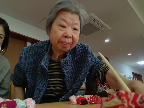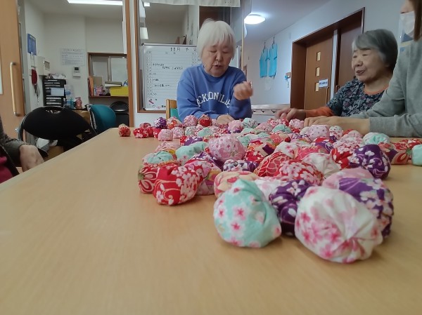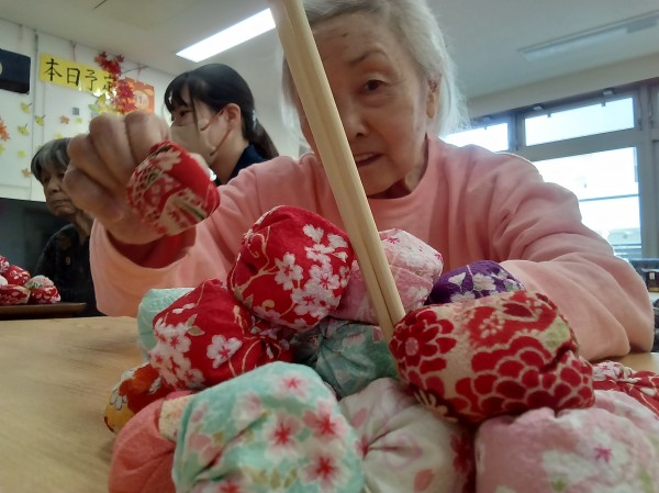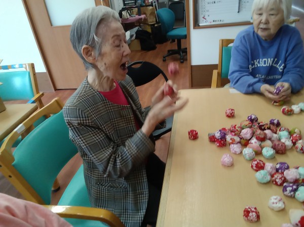 昔は五つ位は出来たのにー。や、小さいからやりにくい…などと言いながらも、皆さん上手にお手玉をされていました(*^-^*)