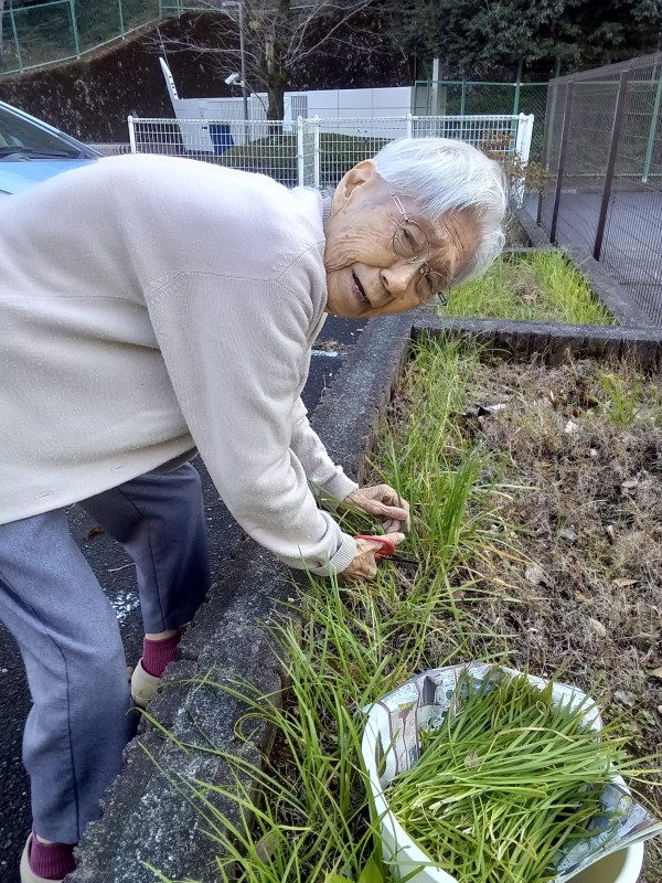 そんな初冬の空気の中、今日はおふたりのご利用者様と一緒に、ホームの庭で元気に育っているニラの収穫を行いました。