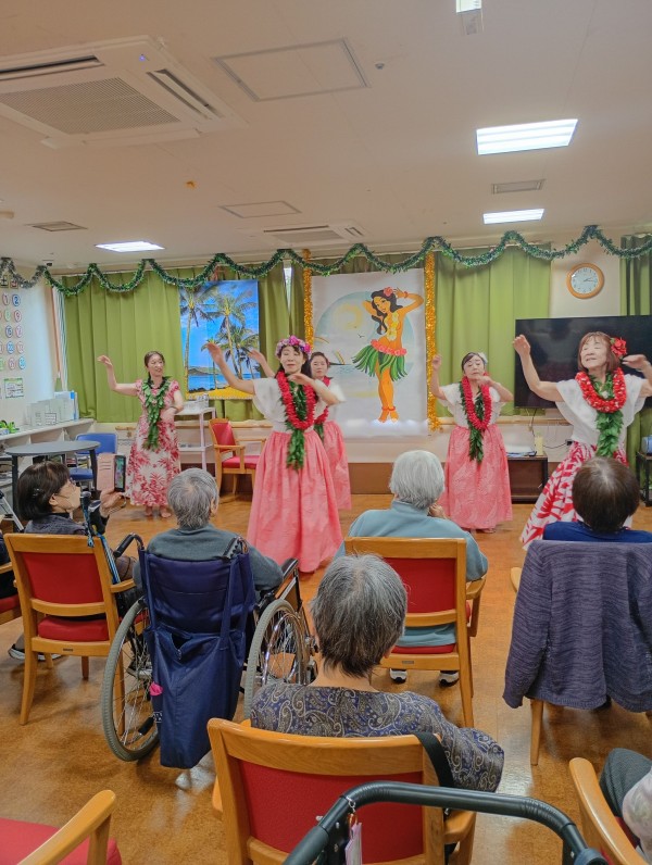 今回は、先日、1階デイサービスにて行なった「フラダンス」の様子をお伝えします。