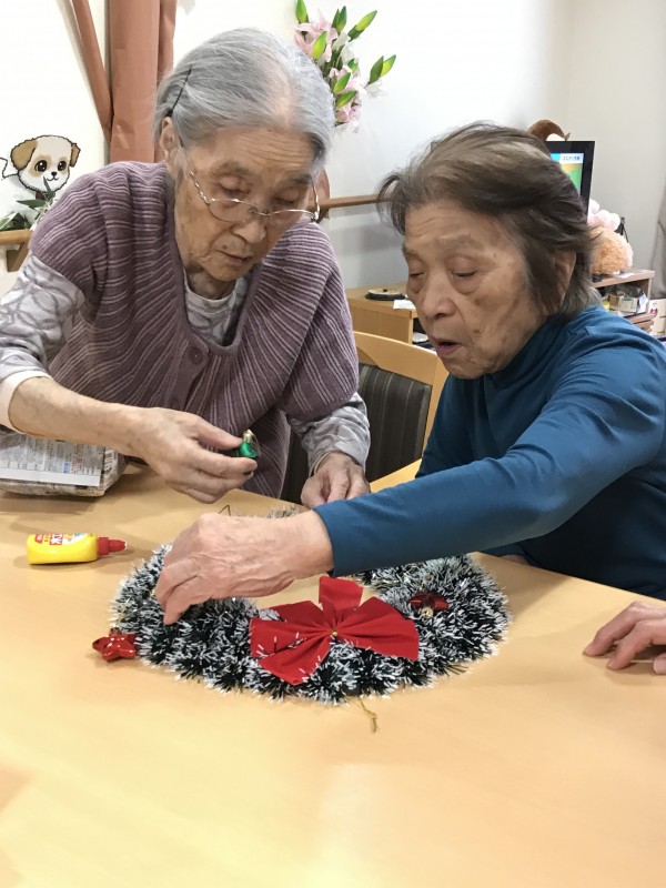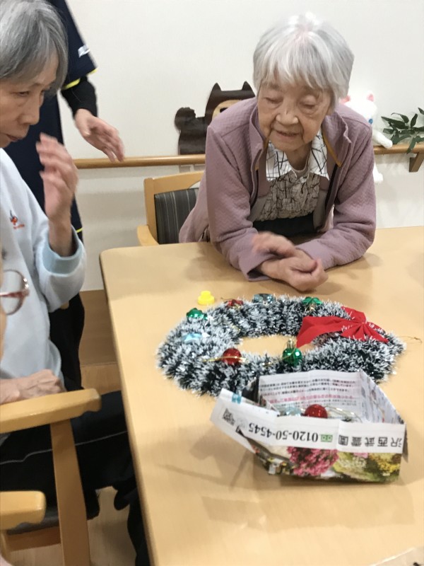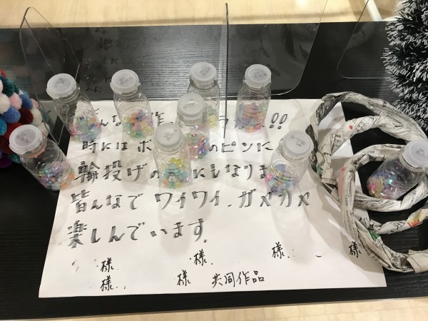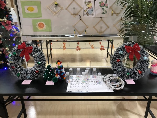 クリスマスリースと、卓上ボウリングや輪投げなどのゲームにも使えるキラキラボトルです♪