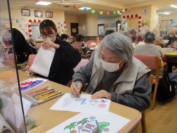 皆様じっくりと色を選び、丁寧に塗り進みながら、「ここは明るい色の方が華やかね」「ここは何色にしようかしら?」と職員や周りの方と会話をたのしみつつ集中されていらっしゃいました。