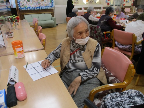 ゲームがスタートすると、「あと一つでリーチだよ!」「おしい!」と真剣な眼差しでカードを見つめながら、どんどん盛り上がっていきました。景品があるわけではないのですが、リーチ!ビンゴ!の声が響き、皆様大興奮!笑顔いっぱいの楽しい時間となりました。12月の雰囲気を味わいながら、脳トレにもなるビンゴゲーム。クリスマス日のクリスマス会では景品付きビンゴ大会もありますのでどうぞお楽しみに♪