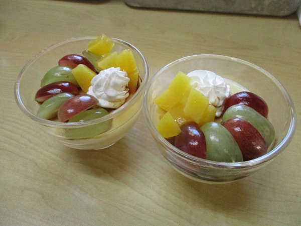仕上げには、赤と緑、二色のブドウを添え、ふんわりとしたホイップクリームと、サイコロ状にカットした黄桃を彩りよくトッピングしました。
