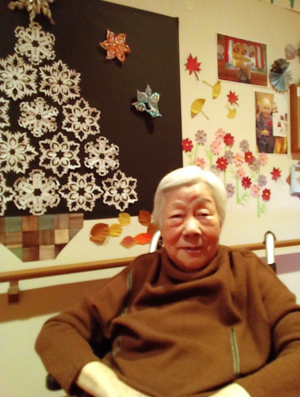 ケアスタッフお手製の折り紙で作った雪の結晶のクリスマスツリーを背景に記念撮影♪(*´∀`)