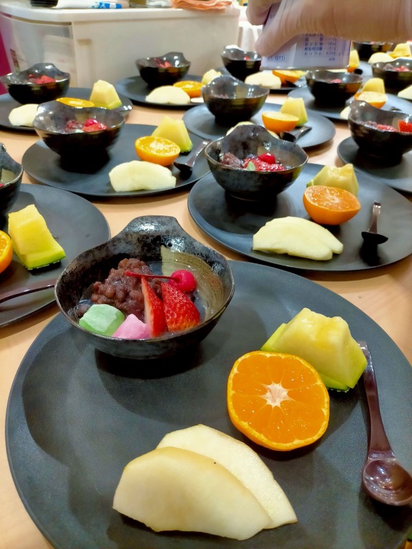 今回は手作り餡子を使って【手作りあんみつとフルーツ盛り合わせ】でした。