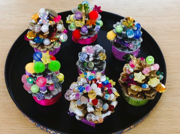 こちら、松ぼっくりです。以前に紅葉狩りに行った際に拾ってきたものを使って、ビーズや飾り物をボンドで付けていきます