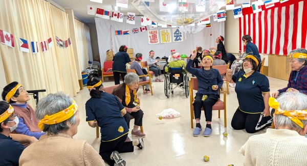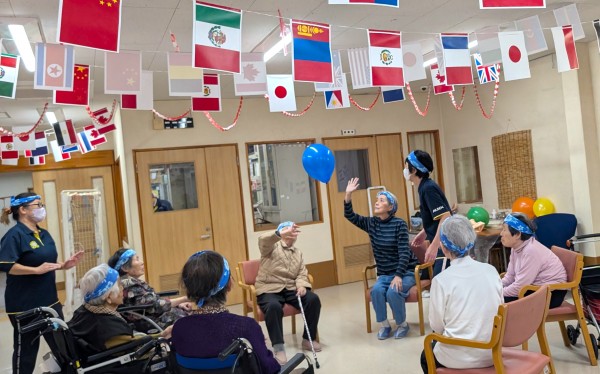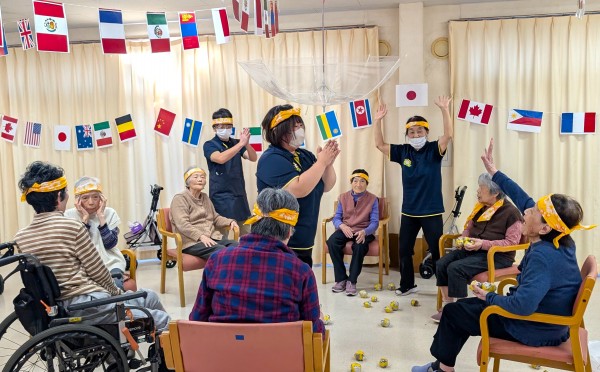 いきおいよく投げるご利用者様達と落ちた球を拾いまくるスタッフ