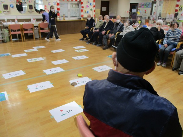 「思った方向に行かないな」「力加減が難しいね」と、皆様真剣な表情。ボールが高得点の位置に止まると、自然と拍手が起こり、ホールは大いに盛り上がりました。3回打った合計点を競うゲーム形式で、一打一打に集中しながらも、笑顔と声援があふれる時間となりました。