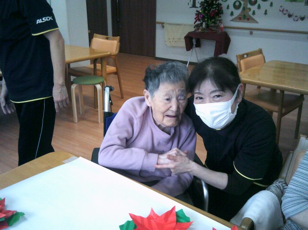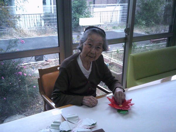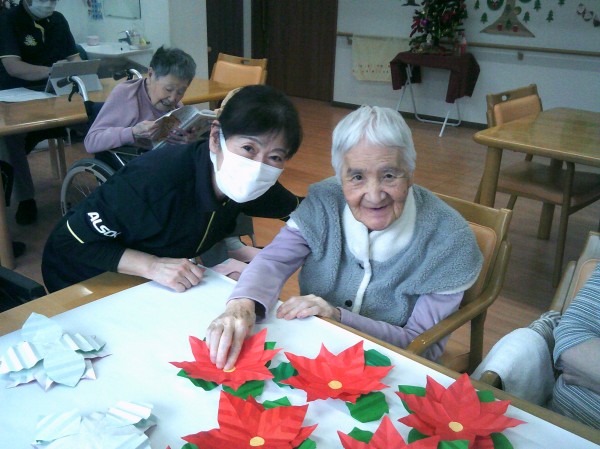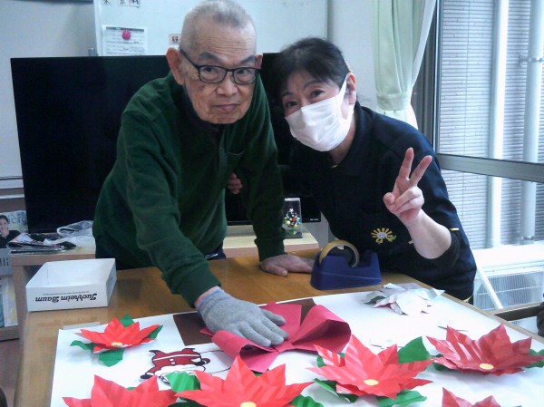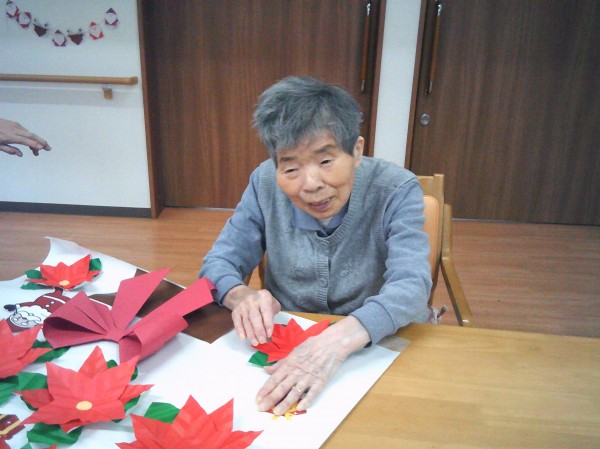 ポインセチアの貼り絵を行っているご様子です( ^ω^)・・・ 凄いね~! 大きなお花で綺麗ね! とビックリでした。