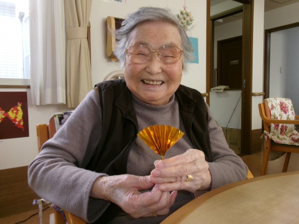今日のレクは、お正月飾りの“梅の花”“扇子”