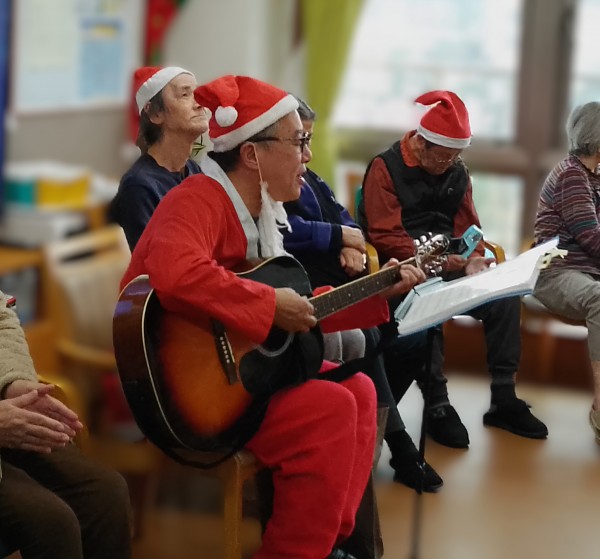 サンタクロースに扮したホーム長のギターで合唱がスタート♪