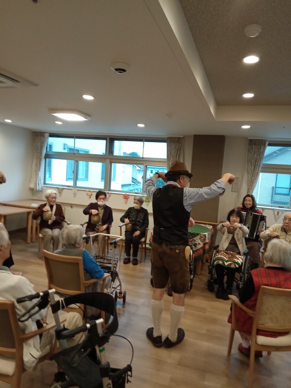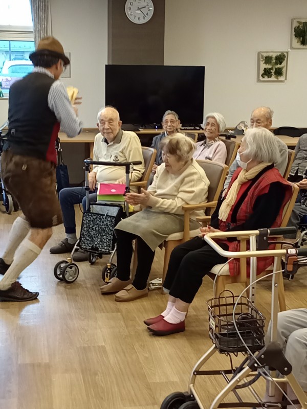 アルプホルンはとても長い楽器で、入居者様も職員も興味津々でした。