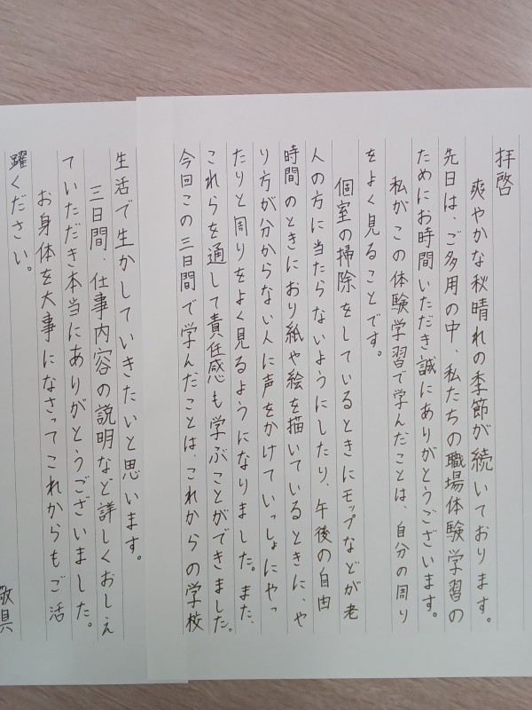 いつもスタッフブログをご覧いただきありがとうございます。2025年最終のブログに、このような感謝のお手紙を頂けるなんて!!!本当にありがたいデス❤良い年越しが迎えられそうです。11月5日に来所された中学生の社会体験事業に来られた中学生4名の方々よりお便りをいただきました。事業体験の感想と感謝のお便りでした(^^♪文書もそうですがしっかりとした中学生を感じました。反対に私達もいい体験と思い出になりました。ありがとうございます。今年は色々とお世話になりました。来年度もグループホームみんなの家松伏をよろしくお願いいたします。ブログもよろしくお願いいたします。よいお年をお迎えください。