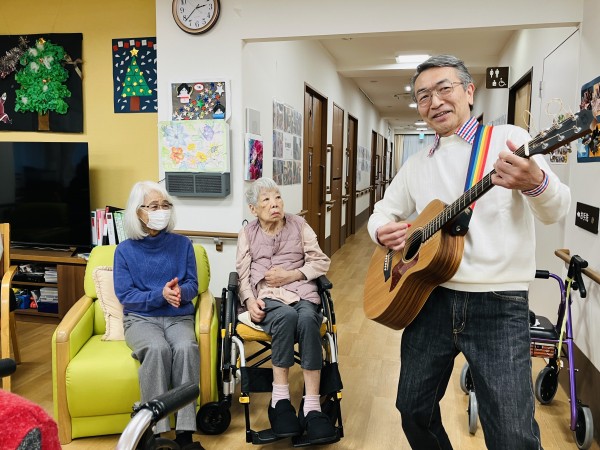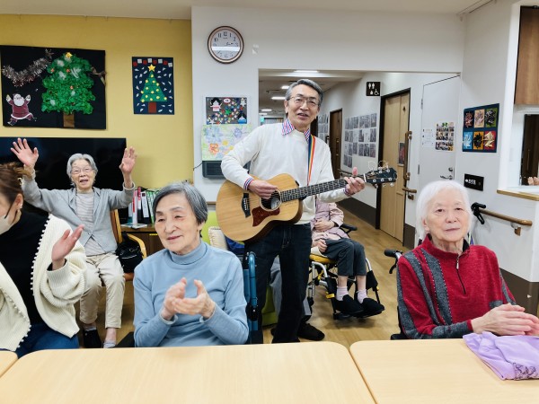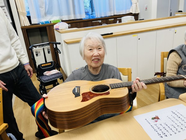 昨年の9月から来て頂いています。ギターコンサート♬ 回を重ねる度に違うギターを持ってきて下さり、皆さん興味津々!!(昨年12月のご様子です)