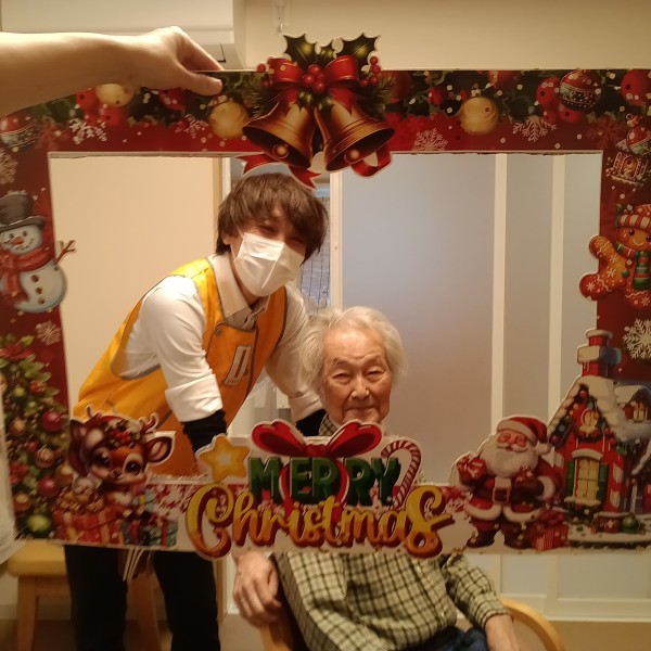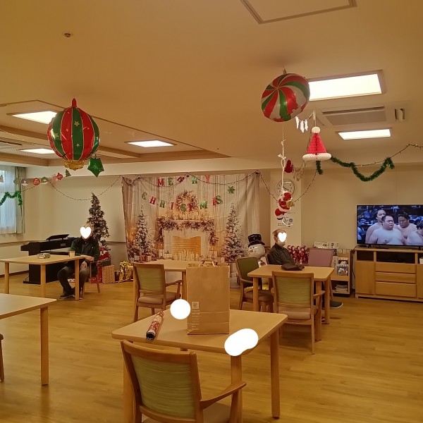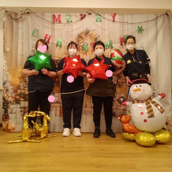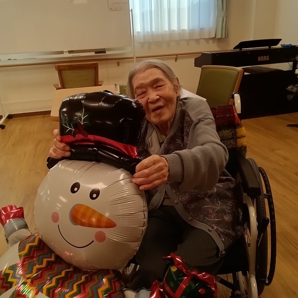 風船やサンタクロースがいて、二階は特に低い位置に風船がぶら下がっているため、食事のたびに皆さんタッチして居室へ戻られる姿がありました。