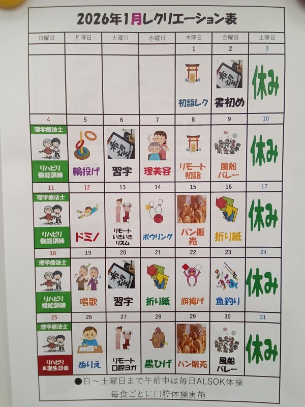 元旦には施設内に作った神社でお参りをして頂いておしるこをお出しします(^_-)-☆
