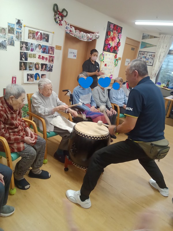 利用者の皆様は、365歩のマーチの歌に合わせて太鼓を打ちました。リズミカルな歌なのでノリノリで楽しそうでした。(^^)