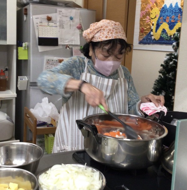 キッチンに立っていただき、野菜を炒めてくださっています。