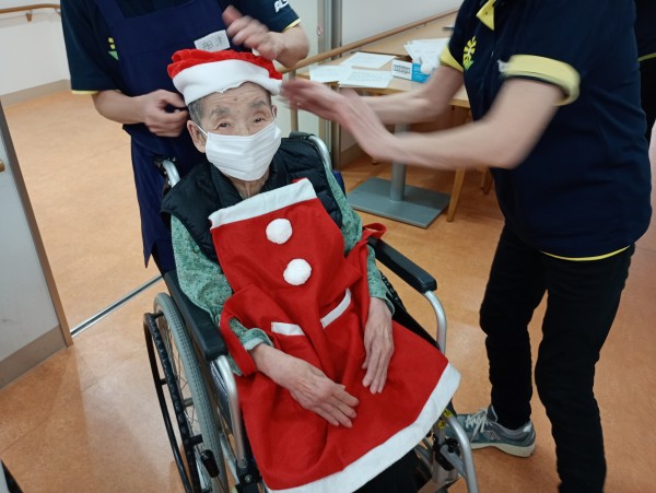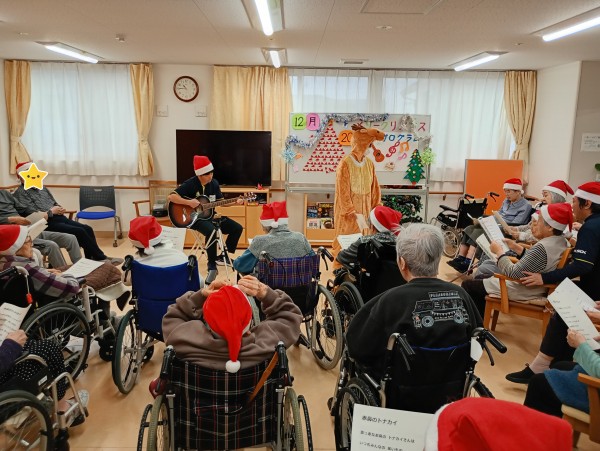 職員がサンタクロースとトナカイになり、入居者様の前で演奏を行い、みんなで合唱しました。