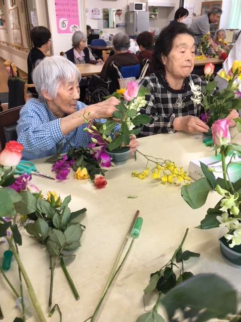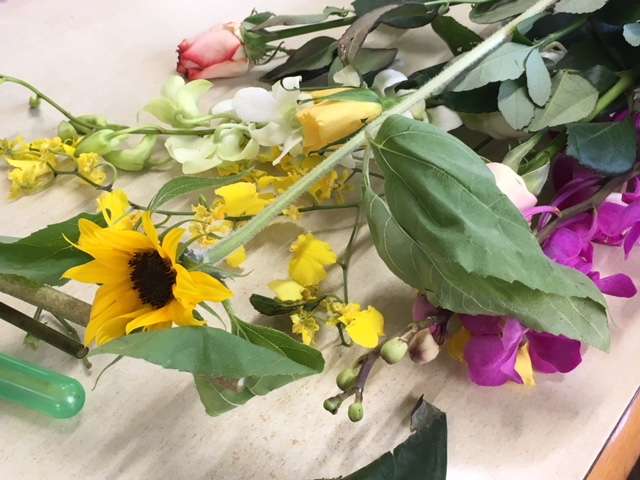 「さあ、みなさん、今日は、お花で顔を作るつもりで活けてくださいね」
