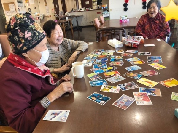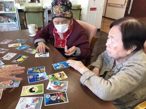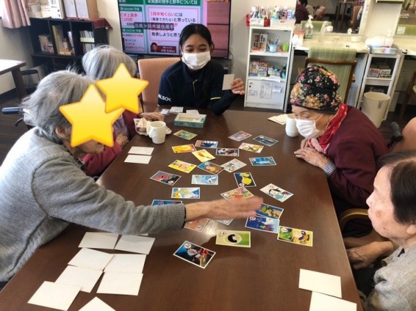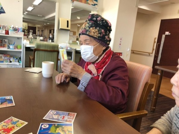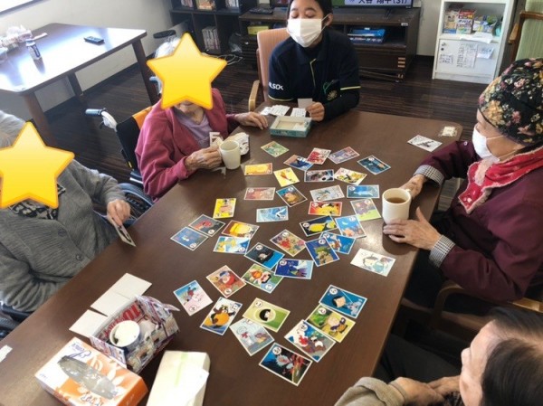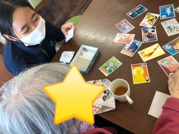 午前中のゆっくりとした時間を狙って近くにいた方を集めてカルタをした様子です♪♪
