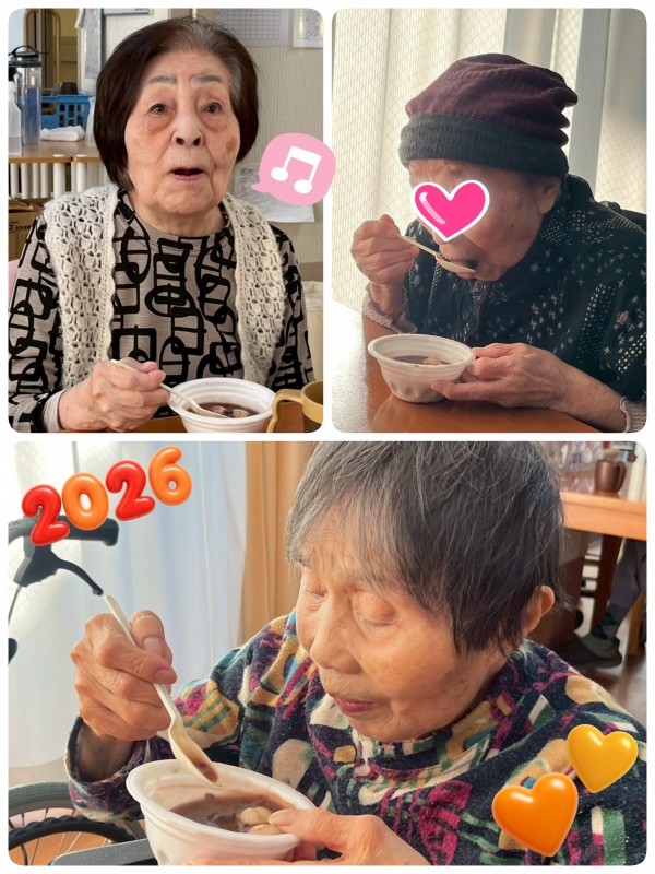 数年前から、松井ホーム長が皆様にお正月を楽しんで頂きたいと作り始めた手作りのお汁粉。愛情たっぷりの手作りお汁粉です。