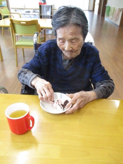 今日はおやつに紅白饅頭を提供しました。 召し上がられているご様子をお知らせいたします!!