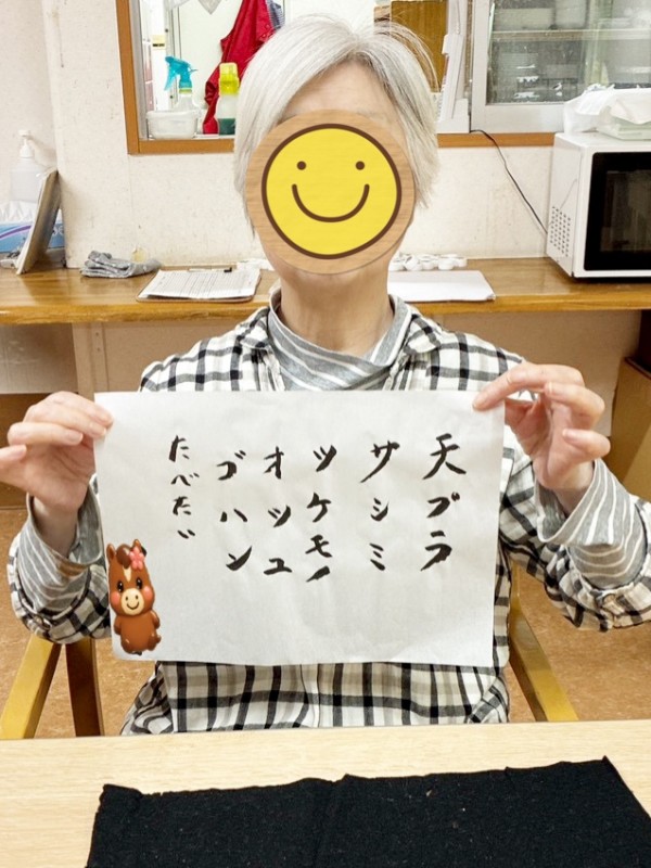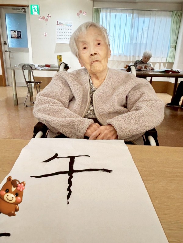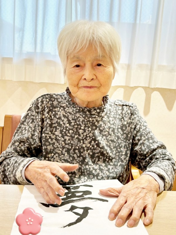 S様は何を書こうか迷われた末、娘様のお名前を書かれていました。Ⅰ様も最初は迷われていましたが、職員がアドバイスすると、スラスラと筆が進みました。好きな文字を書いて楽しまれる方や、「今年の目標を書いてみましょうか?」とお声かけすると「目標はないなぁ」と笑われ、「では好きな食べ物は?」と提案すると「それいいね!」と、食べ物を書いて満足そうにされる方もいらっしゃいました。