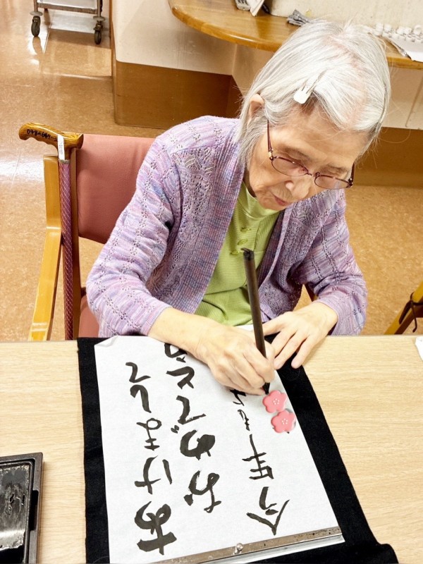 職員と一緒に一文字ずつ確認しながら書かれる方もいらっしゃいました。Y様は「そんなの出来ないよう」とおっしゃいながらも、いざ始めると「正月」のニ文字を一気に書き上げられ、力強い作品が完成しました。Ⅰ様は書道の段をお持ちで、「ここは跳ねるんだっけ?とめるんだっけ?」と少し迷われながらも、「謹賀新年」をとても達筆に書いてくださいました。
